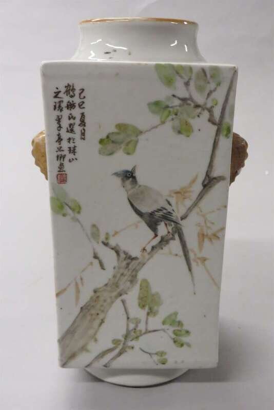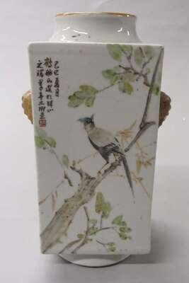 The vase with square cross section, double elephant and faux ring handles, the panels painted freely with birds and liuhai.