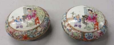 Circular box enameled with seated female figure and boy in interior setting, within flower boarders to cover and base.