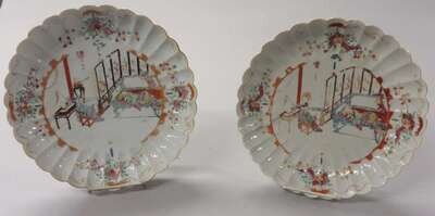 Decorated to interior with figures in an interior setting surrounded by auspicious symbols.