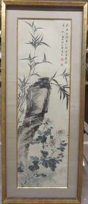 Framed and behind plexiglass, ink and color on paper depicting bamboo and chrysanthemums; sight H: 41 1/2 x W: 12 1/2 inches