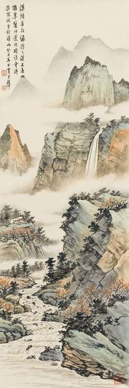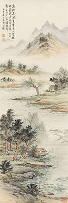 Ink and color on paper, each depicting one of the four seasons, signed and sealed; H: 38 inches W: 13 inches