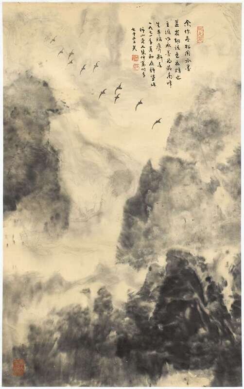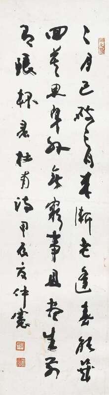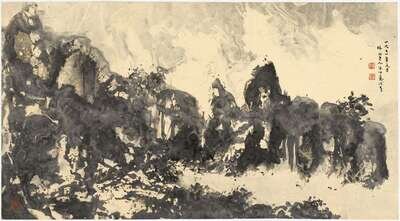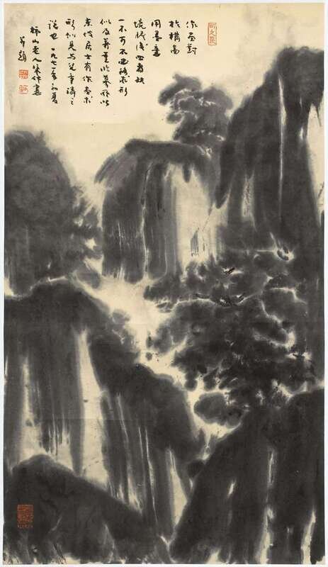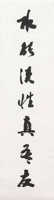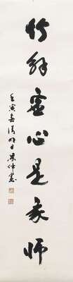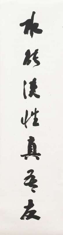 Including a couplet 48 x 13 inches; an ink on paper mountain landscape hanging scroll 23 x 13 1/2 inches; hanging scroll landscape 23 x14 1/4 inches, and a calligraphy 23 1/2 x 6 3/4 inches, and a horizontal landscape 32 17 1/4 inches