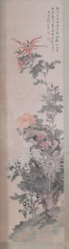 Ink and color on paper, both with inscription and artist sealmarks, sight H: 50 1/2 inches x W: 12 3/4 inches.