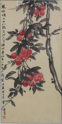 Ink and color on paper, mat and framed; signed Yi Yun and with one artist seal "yi yun xiao xi"; H: 26 inches; W: 13 inches
