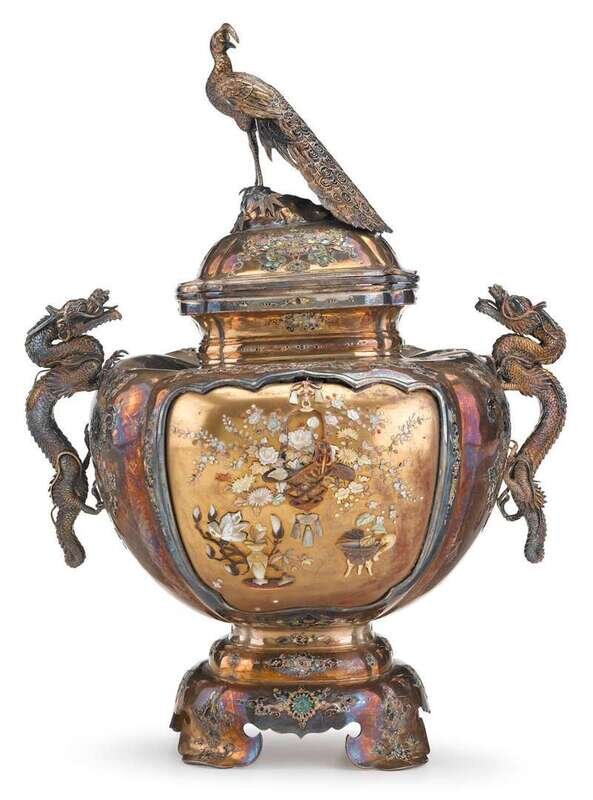 Japanese Shibayama style silver tripod koro and cover 19th century