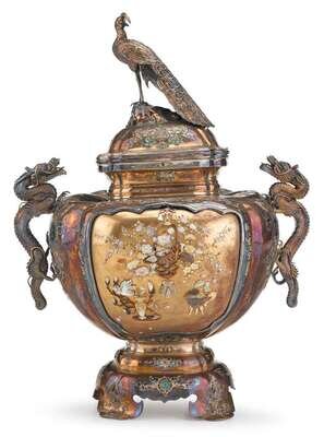 Globular high shoulder form, raised on tripod tiered base, with twin dragon handles and peacock as cover finial, Incised to base with Yoshihide mark.