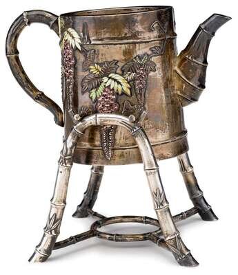 The cylindrical pot is supported on an elevated bamboo-form stand for warming, the handle and spout of the pot cast naturalistically as bamboo sections, the body adorned with amethyst and cloisonne enamel depicting grapes hanging from the vine.