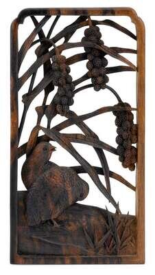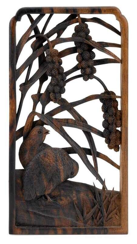 The delicate and diminuitive openwork plaque carved to show two quail below an overhanging grassy plant with clusters of berries; the wood with dramatic two-tone contrast.