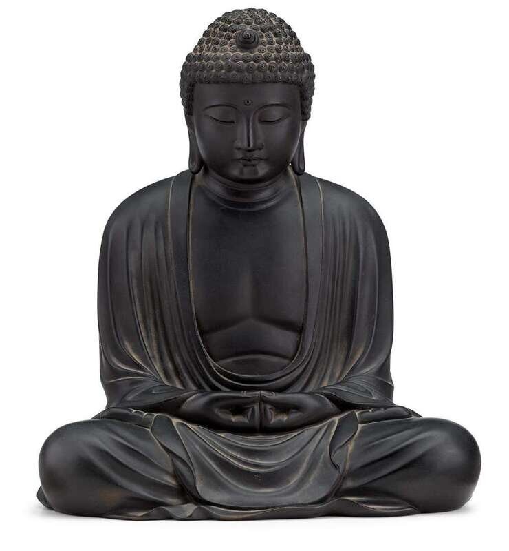 Finely cast in dhyanasana with serene expression, hair tightly curled and pendulous earlobes touching the shoulder, inscribed to base with signature.