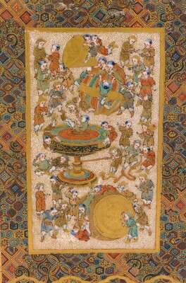 The slightly tapered and straight walled tokkuri-style vase decorated with colorful enamels and gilding to show scenes of noblemen in a garden and a fantasy of miniature boys at play within rectangular panels and to other sides with cartouches of birds and butterflies among flowers, all over an intricate and irregular geometric ground.