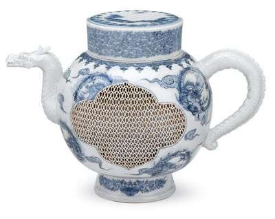 Fashioned with openwork 'basket-weave' sides, the spout and handle modeled as the head and tail of a dragon, the globular body painted with dragon roundels and the cover with pine sprig.