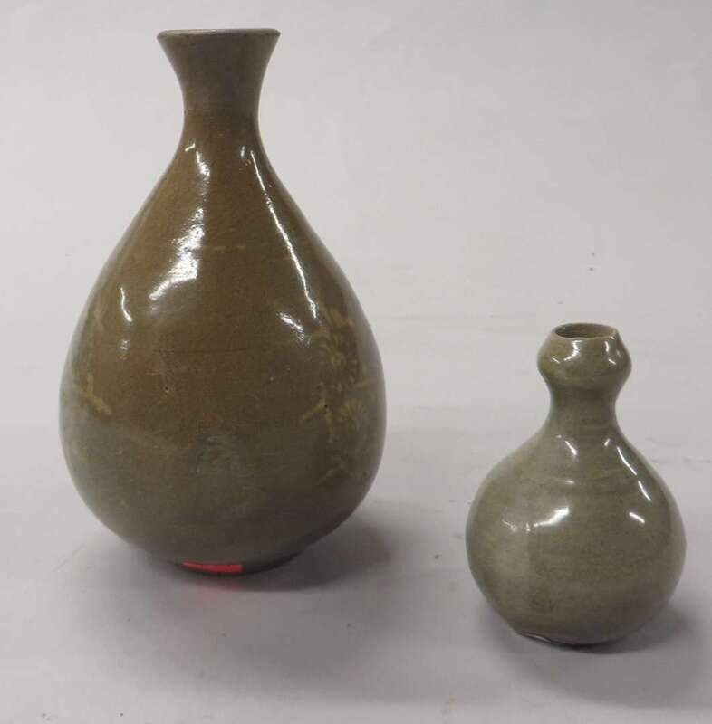 A taller pear form vase decorated with four flowering sprigs around body, together with a shorter garlic head vase.