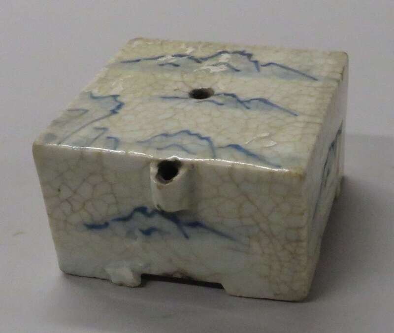 Set on four short bracket feet and moulded with a cylindrical side spout, painted on the flat top in dark and medium strokes of underglaze blue with mountainous landscapes.