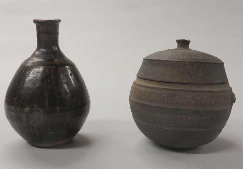 Including a pear form brown glazed pottery vase and a globular stoneware jar incised to body with basket-weave pattern.