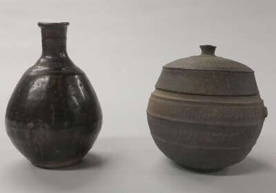 Korean brown glazed bottle vase together with a stoneware covered jar