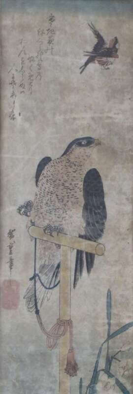 UTAGAWA HIROSHIGE (ANDO) (1797-1858) 1830S Falcon on Perch with Sparrow and Narcissus