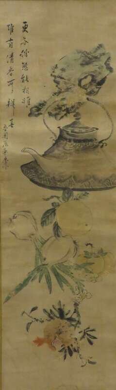 Ink and color on paper, signed and artist sealmark, still life of kettle and fruits, sight H: 32 inches W: 9 3/4 inches