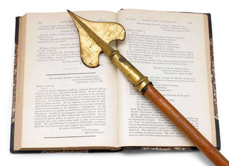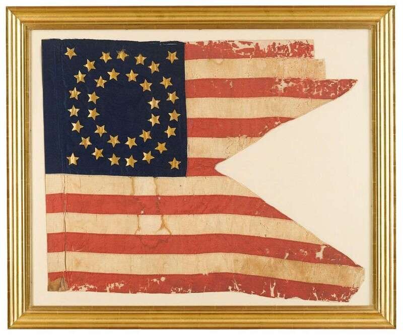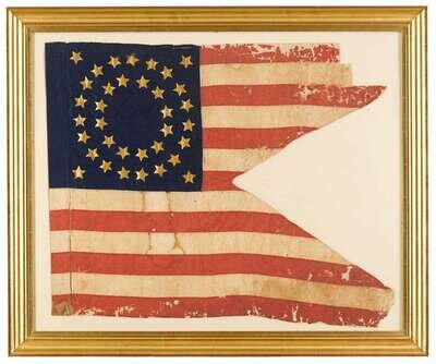 The hand-sewn silk swallowtail flag comprised of thirteen white and red stripes and blue canton stenciled with thirty-five gold stars, as prescribed in General Order No. 4 of January 18, 1862; together with the color's original staff with brass finial, and a copy of the Annual Report of the Adjutant General of Pennsylvania, Transmitted to the Governor in Pursuance of Law for the Year 1887(1888).