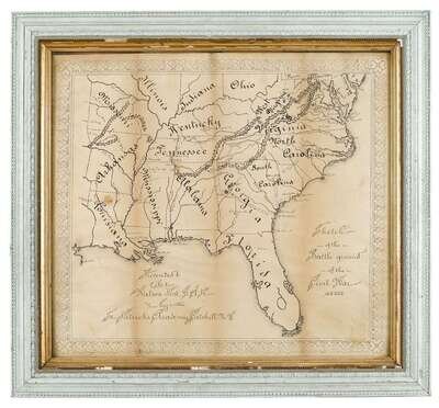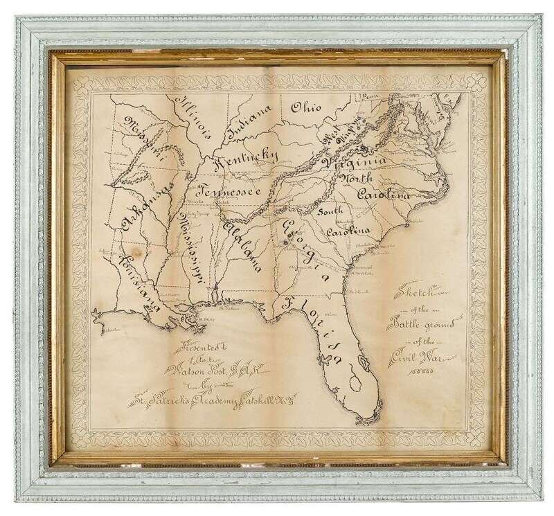 Map showing the major battles of the Civil War, "Presented to the Watson Post G.A.R. by St. Patrick's Academy Catskill, NY," ink on paper, framed.