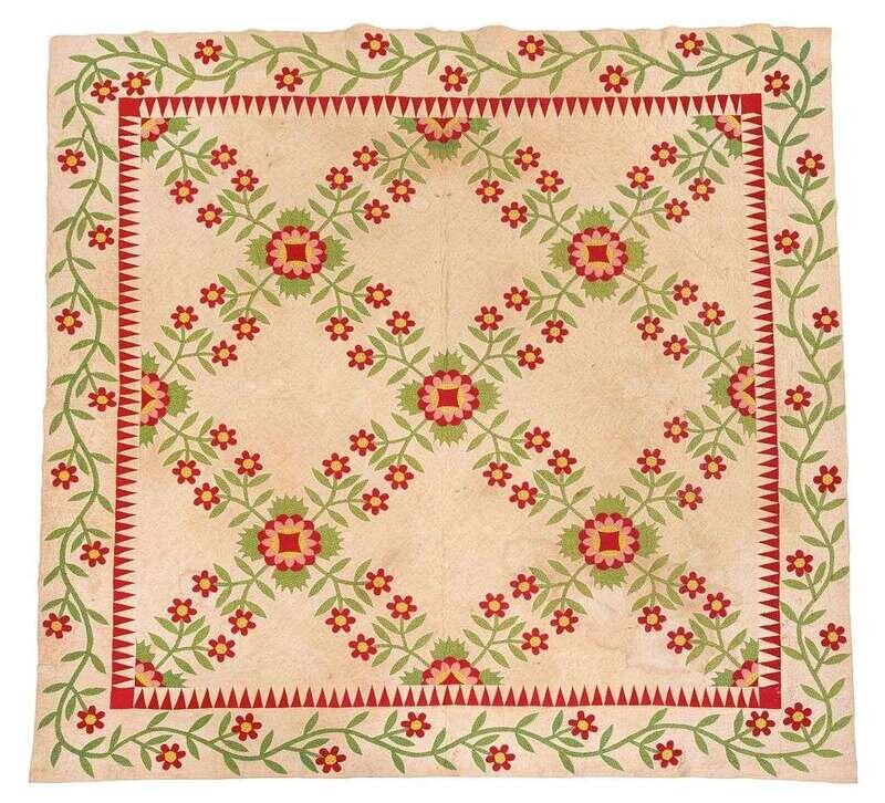 Floral vine and sawtooth border enclosing floral grid, worked in solid and printed cotton in red, pink, green and yellow, heightened with conforming quilting.