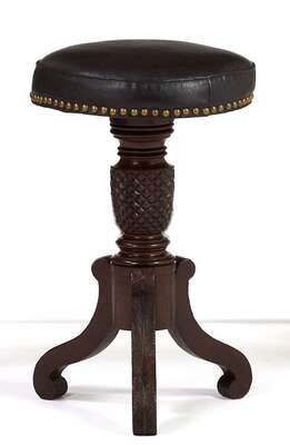 Circular leather-upholstered top above pineapple-carved, urn-form support and three feather-carved scrolled legs.