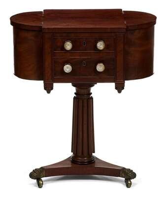 Astragal form with hinged ends above two drawers on reeded columnar support and triangular base with cast brass feet on casters.