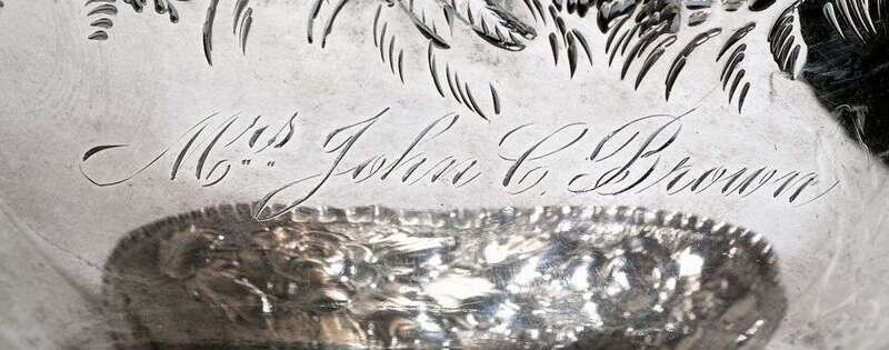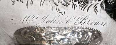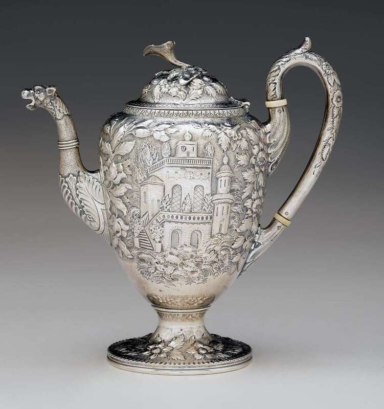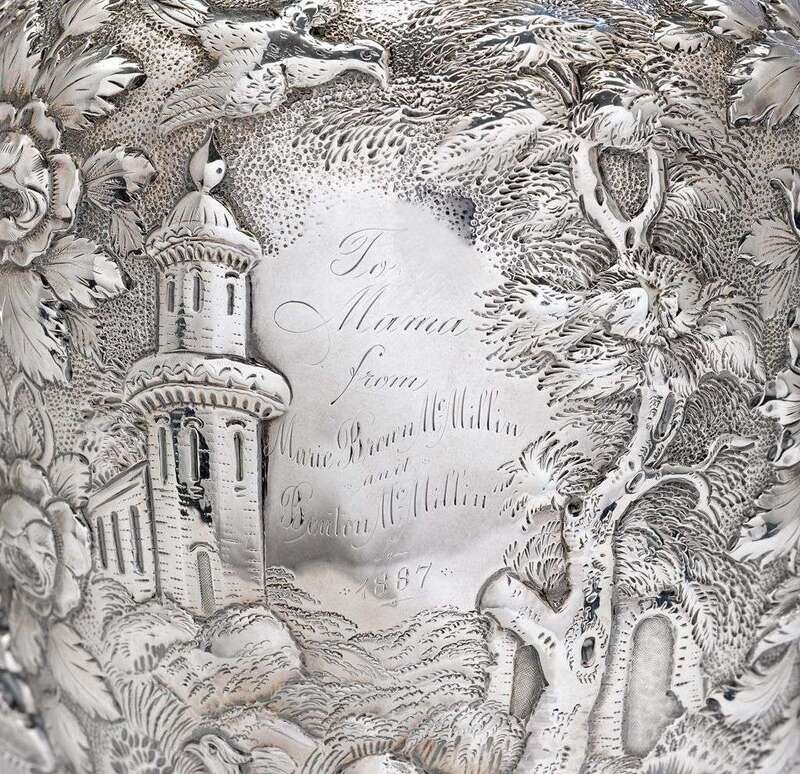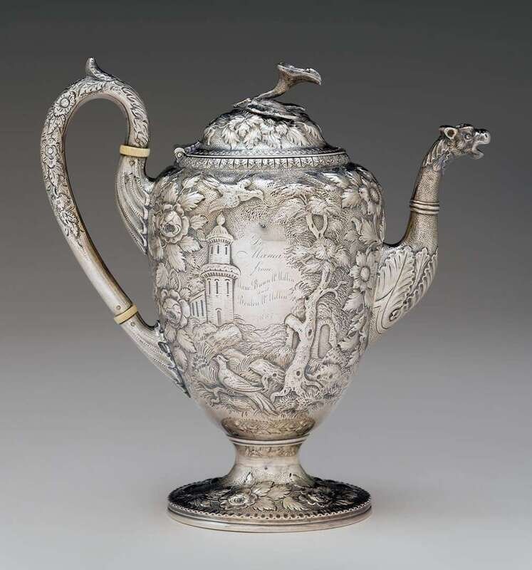 overstriking that for s. kirk & sons, baltimore, md, 1861-1868 Of oval form raised on conforming pedestal foot, all-over heavily repoussé-worked with flowers and foliage against a stippled ground, one side with vignette of festooned building and an adjacent tower, the other side with a tower nestled within landscapes punctuated by birds enclosing engraved dedication: "To Mama from Marie Brown McMillin and Benton McMillin 1887" with the name "Mrs. John C. Brown" engraved near base, the lid surmounted by floriform finial, the spout terminating in bestial head, marked to underside of base.
