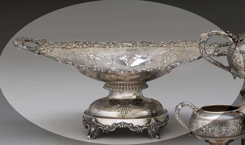 Of oval form, the cavetto decorated with alternating repoussé grape and flower clusters joined by leaves and C-scrolls, the applied cast scrolling floral rim continues to twin foliate handles, all raised on conforming base supported by four acanthus leaf and scroll feet, with engraved dedication: "MHB from P. Clendenen Sept. 1st 1849," marked to underside of base.