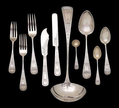 Bright cut engraved, comprising twelve flat handle dinner knives, twelve dinner forks, nine luncheon forks, one dessert fork, twelve tablespoons, eleven teaspoons, twelve demitasse spoons, a ladle, two master salts, and two master butter knives, monogrammed "BB" to the terminuses and "Bryson" to the handle verso, in satin lined box from "Bailey & Co. Philadelphia" with engraved silver dedication plaque to top: "Belle from Father and Mother 1878"