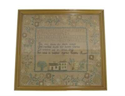 Sawtooth-edged reserve enclosing alphabet, pious verse and house enclosed by floral border, worked with silk threads on a linen ground, framed.