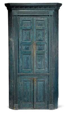 Blue-painted paneled corner cupboard pennsylvania or new jersey, circa 1800