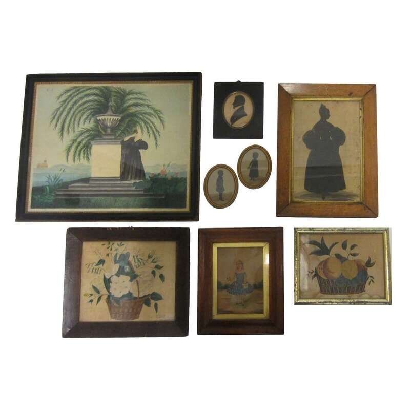 Including a pair of full-length silhouettes of children, a full-length silhouette of a lady, a bust-length silhouette of a gentleman, a full-length watercolor miniature of a little girl and a mourning picture, watercolor on paper; together with two small still lifes.