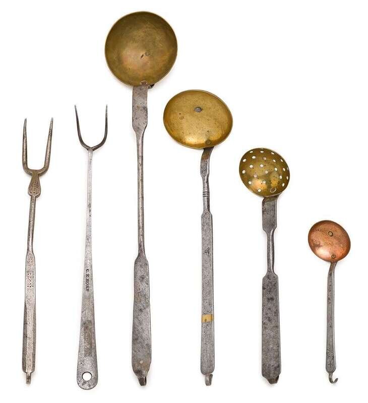 Comprising ladle; two tasters, the first with brass band to handle and incised stem and the second with "wriggled" border; a strainer; and two forks, the first punch-decorated and the second bearing mark of "C.E. Horn," most with hook to terminal.