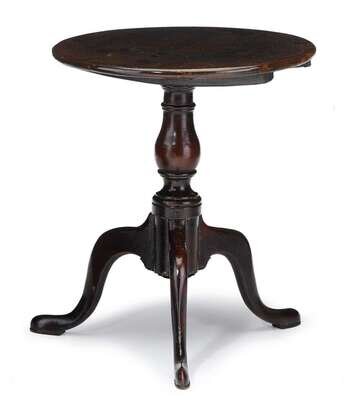 Circular top on baluster turned support and cabriole legs ending in snake feet.