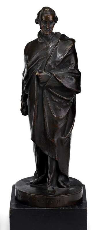 Dark patina, the figure standing atop a circular platform inscribed, "Washington," with associated wood plinth.