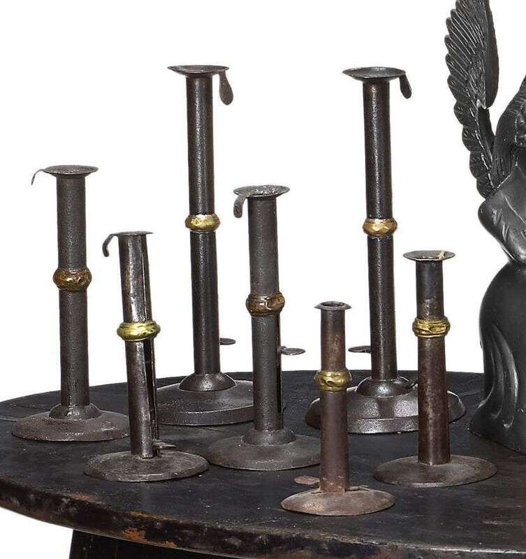 Including seven hogscraper candlesticks with brass rings, two hogscraper candlesticks, three spiral iron strap candlesticks with wood bases, large tinware candlestick, tin twelve-candle mold and group of iron betty and fat lamps, mantle sticks, skewers and lighting accessories including a stenciled tinware tray with iron scissor snuffer.