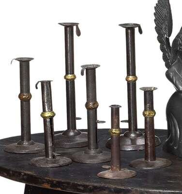 Lighting collection: iron candlesticks, betty lamps, and accessories 19th century