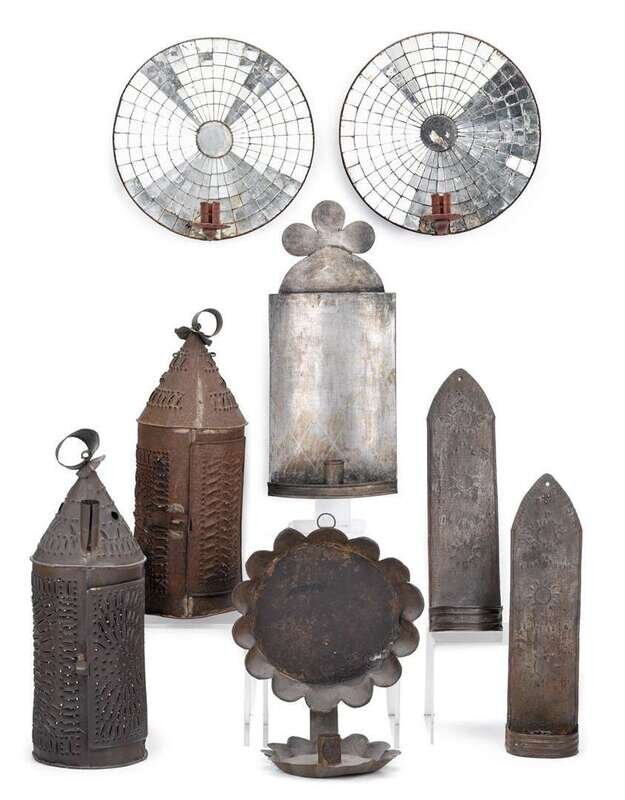 Including a pair of concave mirrored sconces, a pair of tin sconces with punch-worked backplates, a single tin sconce with scalloped backplate and saucer, a single sconce with concave back and two pierced tinware lanterns.