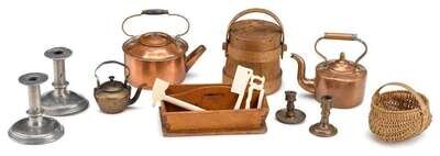 Including two bronze candlesticks, one with saucer base; three copper hot water kettles of various forms; one miniature covered firkin with fingered lap construction and swing handle; a near pair of pewter candlesticks with flat bobeche, ringed stem and domed base; a woven gathering basket; and a knife box with bone tools, saw, axe, cleaver, knife and a bodkin.