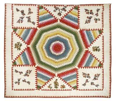 "Star of Bethlehem" with sawtooth edge, comprised of variously printed patches enclosed by appliquéd chintz sprigs, heightened with conforming and feathered quilting, two ends altered for high post beds.