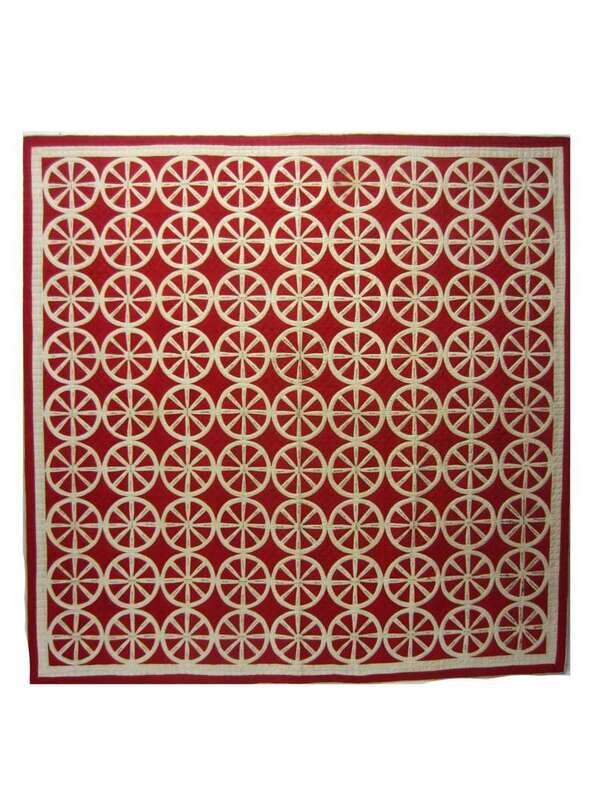 Field of "wagon wheels" inscribed and printed with names heightened with conforming quilting.