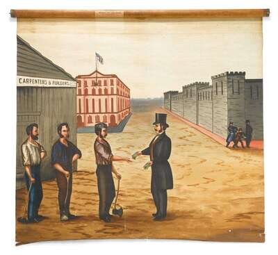 Oil on cloth, the foreground painted to show a gentleman issuing money to three workers queued up in front of a building entitled "Carpenters and Builders," the background with a building flying an American flag and a policeman catching a pickpocket in front of a fortification, the whole affixed to a cylindrical wooden roller bearing a label for "Sawyer & Buckley's patent central bored Improved Stop Shade Roller," patented 1877, 1878, 1879, & 1883.