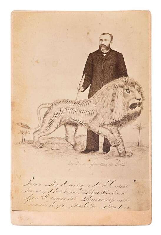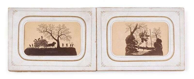 Containing six card leaves with gilt edges containing twelve albumen photographs of scissorworked images, each blindstamped, "G. Schmidt" and mounted within a rounded rectangular window with gilt borders; together with a mounted cabinet card depicting a man holding quill pen and standing behind a lion crushing a sword with his front paw, entitled "The Pen is Mightier than the Sword," "From a Pen Drawing by W.H. Carrier, Teacher of Bookkeeping, Short Hand and Plain and Ornamental Penmanship...Adrian College, Adrian Mich."