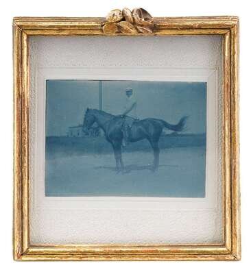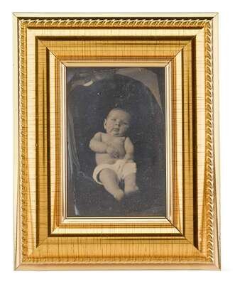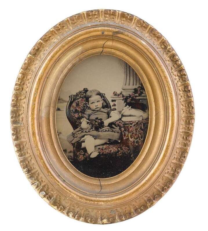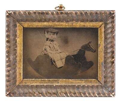 Including a quarter plate tintype of a girl on a rocking horse; a quarter plate hand-tinted ambrotype of a young girl slouched in a chair, a sixth plate daguerreotype of a gentleman, a tintype of a baby; a cyanotype of a man on a horse; and a handcolored photograph of an interior scene with woman.