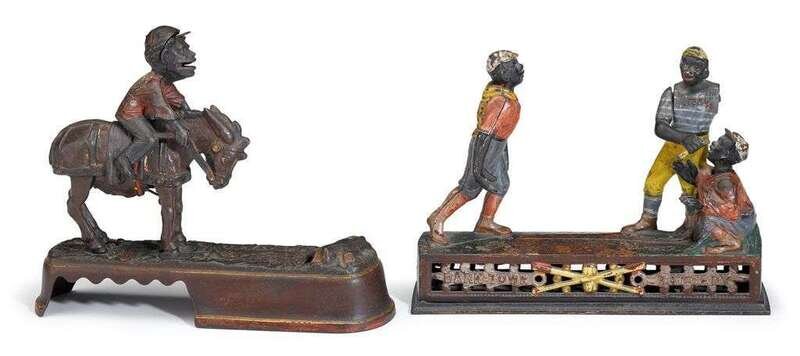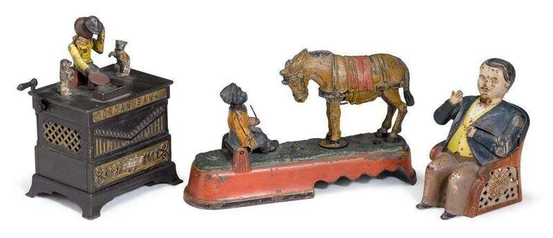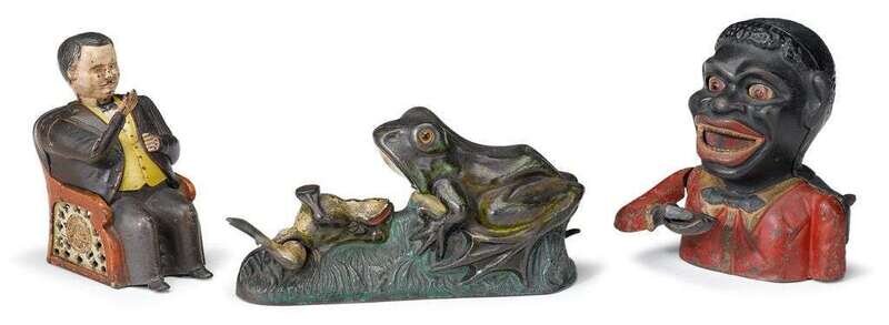 Comprising a Two Frogs bank, circa 1882, designed by James H. Brown, the underside impressed "Pat Apld For" and the coin trap marked, "Pat Feb 2 1875"; a "Dark Town Battery" bank, patented 1888, designed by James H. Bowen; two versions of the "I Always Did 'Spise a Mule" bank, the first with boy seated in front of mule, impressed to underside, "Patd Apr 22d 1879" and the second with jockey riding mule, impressed, "Patd Apr 27 1897"; a Jolly "N" bank with moving eyes; two Tammany banks, designed by John Hall, each impressed to back of chair, "Patd Dec 23 1873," one with coin trap impressed, "Patd June 8 1875"; and an Organ Bank, by Kyser and Rex Company, Philadelphia, with seated monkey flanked by standing figures of cat and dog, impressed to back, "Pat June 13 1882."