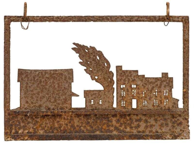 Rectangular frame enclosing silhouetted buildings and tree, weathered.