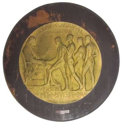 The recto depicting four nude athletes in a queue waiting to receive the laurel branch from a seated Benjamin Franklin, the founder of the University of Pennsylvania, surmounted by "Relay Carnival Founded 1805," with artist's initials, date "1925", and "University of Pennsylvania" below, affixed to a circular wood plaque.