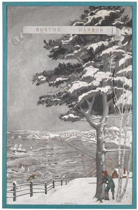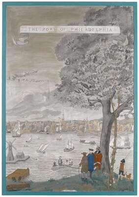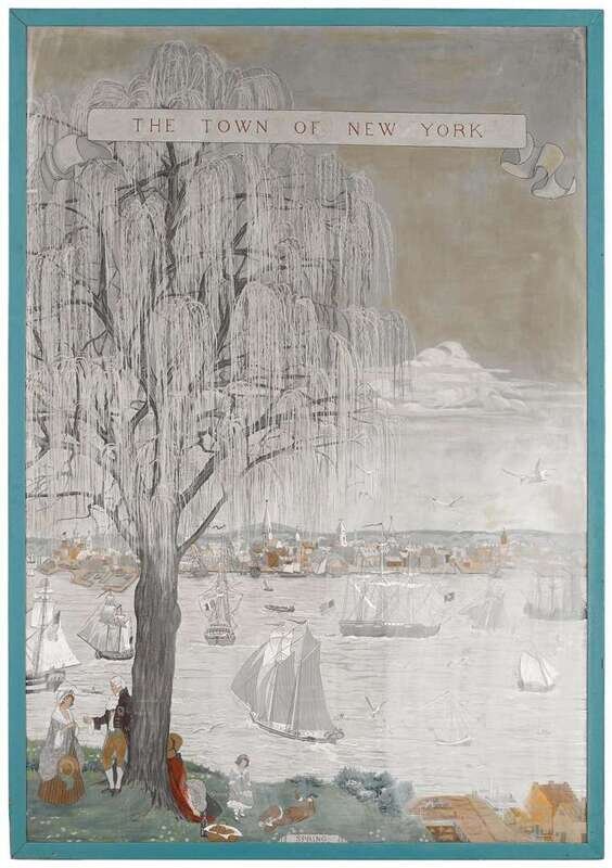 Inscribed in crayon on verso of New York panel, "M.S. Hinchman 3635 Chestnut St. Phila," bears printed label of National Society of Mural Painters Exhibition with added notes, "one of 4 panels, Boston, N.Y. Phila, Charleston painted for the Washington House SesquiCentennial," gouache on paper, painted wood strip frames.