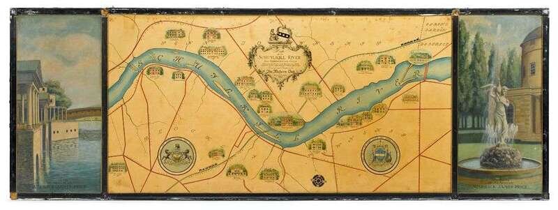 Signed and dated, "1941," gouache and ink on board; presented to The Modern Club, "Showing the Roads and Residences which existed in the adjacent territory before 1850," flanked by panels depicting Philadelphia Waterworks, in memory of Wallace James Price.