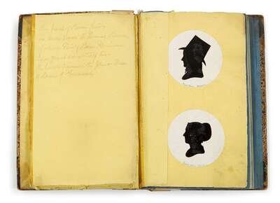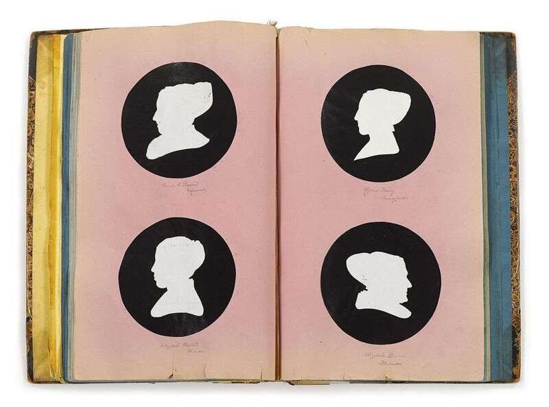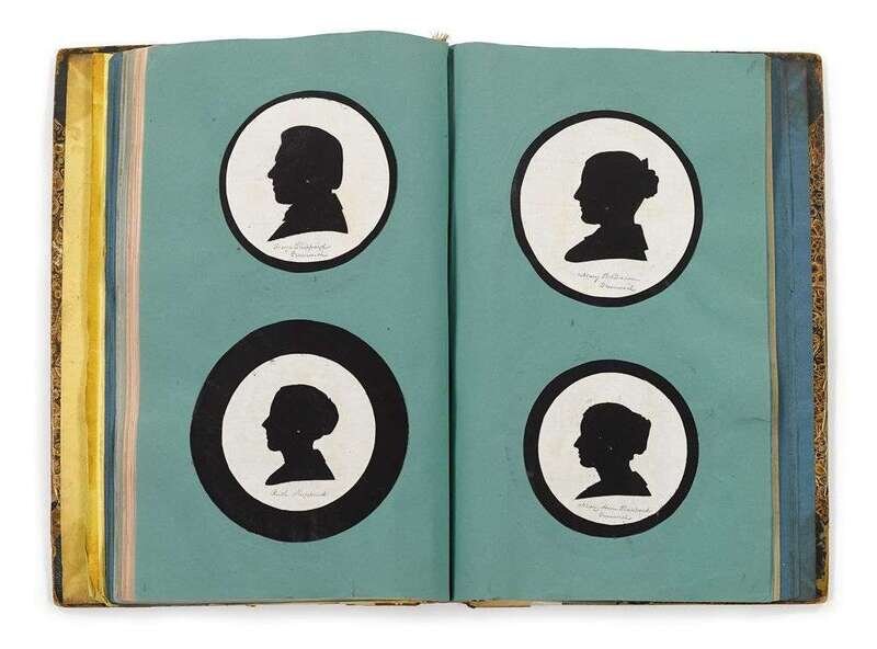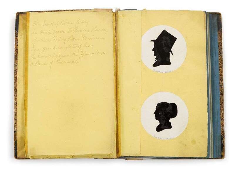 Inscribed, "This branch of the Bacon family is much nearer the Thomas Bacon of which Emily Bacon Morrison is a granddaughter of his--the branch begins with John & Ann H. Bacon of Greenwich," comprising 132 black or white paper silhouettes pasted to white or black contrasting circles on variously colored stock, in marbled board album. Each sitter identified in pencil with name and place of residence. Families include Comfort, Evans, Reeve, Mickle, Rhoades, Haines, Starr, Lippincott, Pine, Jones, King, Peirson, Wood, Richards, Newkirk, Sheppard, Hancock, Morgan, Roberts, Haverstick, Scattergood, and Miller, of Philadelphia, Norristown, Spring Mills, Chester Valley, Springfield, and Germantown, Pennsylvania and Greenwich, Bridgeton, Morristown, New Jersey.